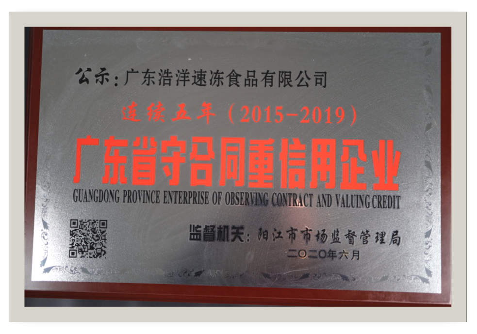2020,浩洋食品榮獲由陽(yáng)江市市場(chǎng)監(jiān)督管理局頒發(fā)的:連續(xù)5年(2015-2019)“廣東省守合同重信用企業(yè)”牌匾。
