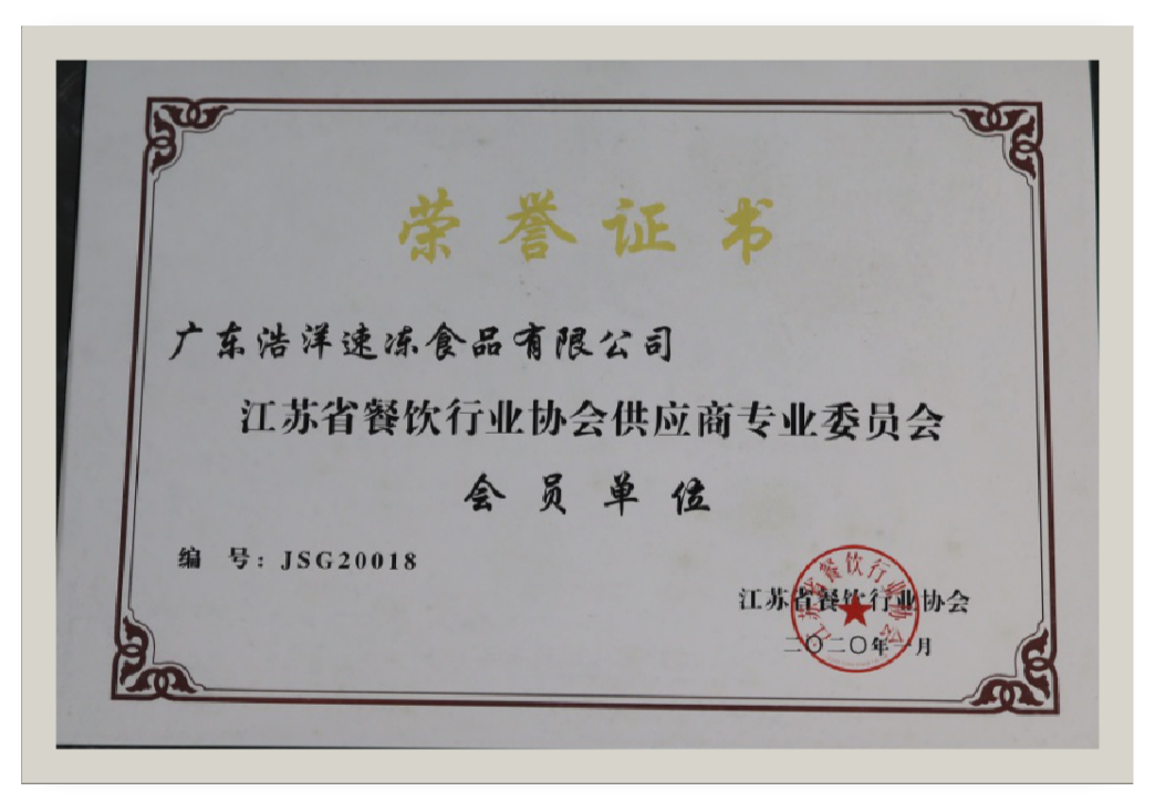 2020年,浩洋食品獲得江蘇省餐飲行業(yè)協(xié)會(huì)頒發(fā)的 “會(huì)員單位 ”。