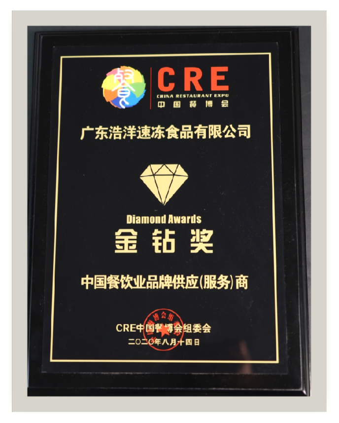 2020,浩洋食品”獲得中國(guó)餐飲業(yè)品牌供應(yīng)商 “金鉆獎(jiǎng) ”。